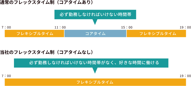 当社グループでは、コアタイムのないスーパーフレックスタイム制度を採用。業務の状況や家庭の事情などに応じて、毎日各自で始業時間・終業時間を決めています。一日あたりの就労時間も個人の裁量に委ねられているため、「今日残業を頑張った分、明日は15時に帰ろう」などメリハリをつけて働くことができます。